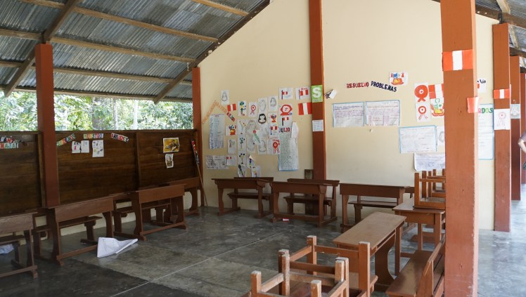 Les batiments font très neufs, avec de belles finitions, une présence ecclésiastiques partout, beaucoup d’artisanat et de décoration. Cela dénote beaucoup avec tout le reste des batiments que nous avons vu depuis notre arrivée. Nous sommes étonnés du traitement si spécial (et luxueux) qu’ont les muets dans la culture Awajun. Après avoir redemander à Rosita plusieurs fois pourquoi il y a autant de personnes muettes chez les awajun, nous comprenons enfin que depuis le début il ne s’agit pas de muets mais de moines…. vive les erreurs de traductions ! Ainsi, tout prend un peu plus de sens. Le père de famille peut choisir d’envoyer son enfant dans cette école et à l’arrivée au secondaire l’enfant choisi s’il souhaite continuer dans une voie religieuse ou pas du tout. Les enfants allant à cette écoles doivent porter un voile devant la bouche durant toute leur scolarité.