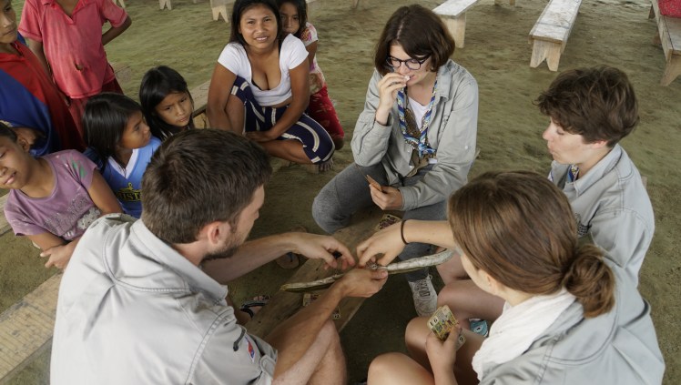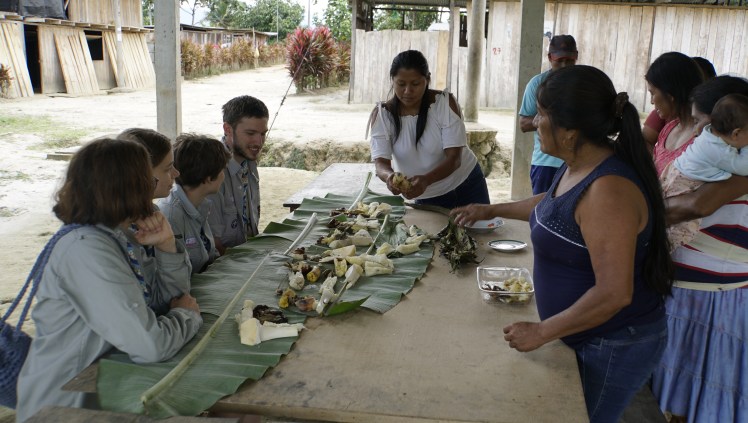 Mercredi, dernier jour en forêt amazonienne. Nous offrons différents cadeaux aux communautés nous ayant accueilli. Des tôles pour les Sawiensta et du ciment pour les Umukai qui souhaitent réaliser un sol pour leur maison d’artisanat. Pour Nelida notre hôte typiquement péruvienne, qui aime parler TRÈS fort le matin et si possible très très vite de sorte que nous ne comprenions rien, nous lui offrons une poêle à crêpe !